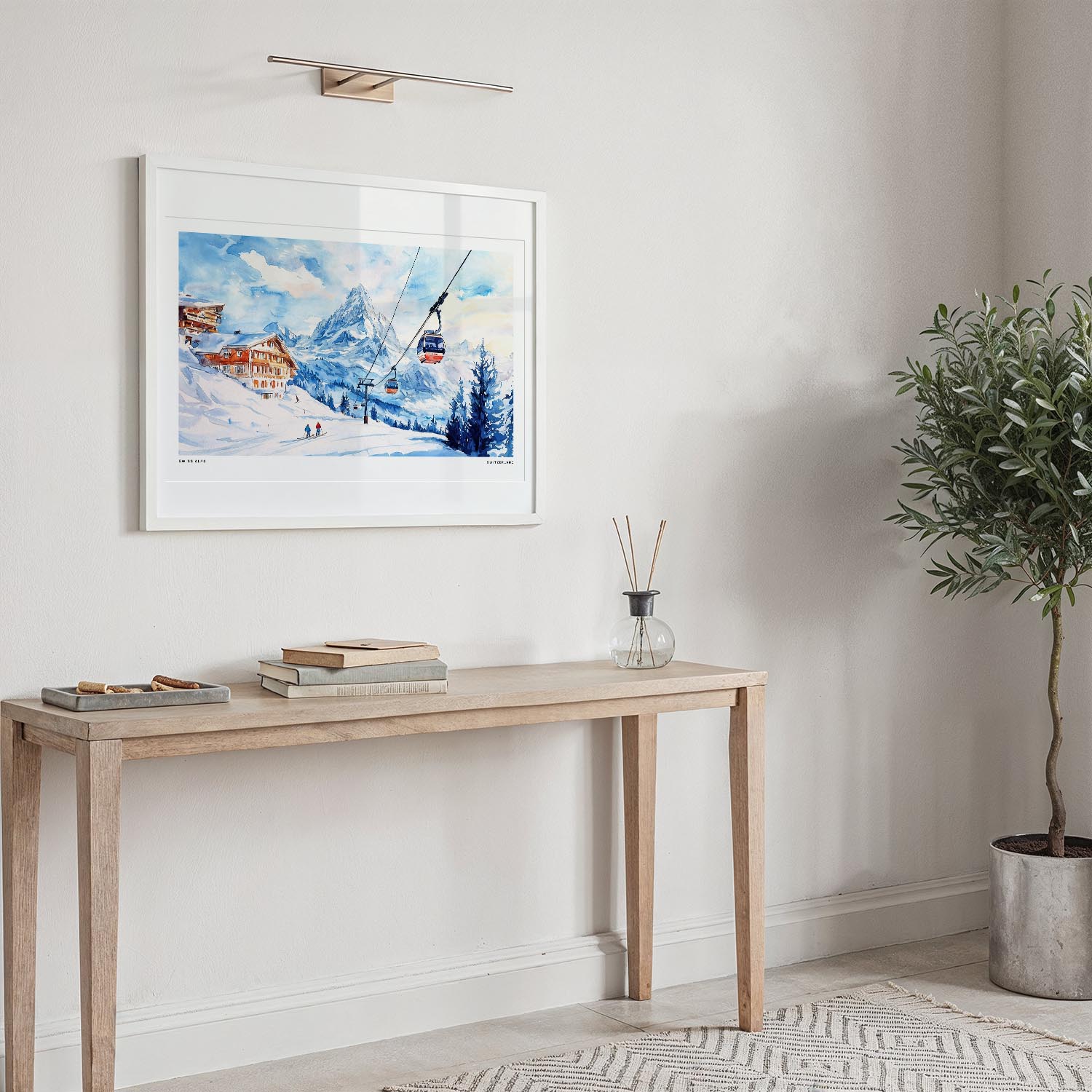 Capture the essence of the Swiss Alps with this watercolor art print. Ideal for brightening up your living room or office, it invites a touch of winter wonder into any space.