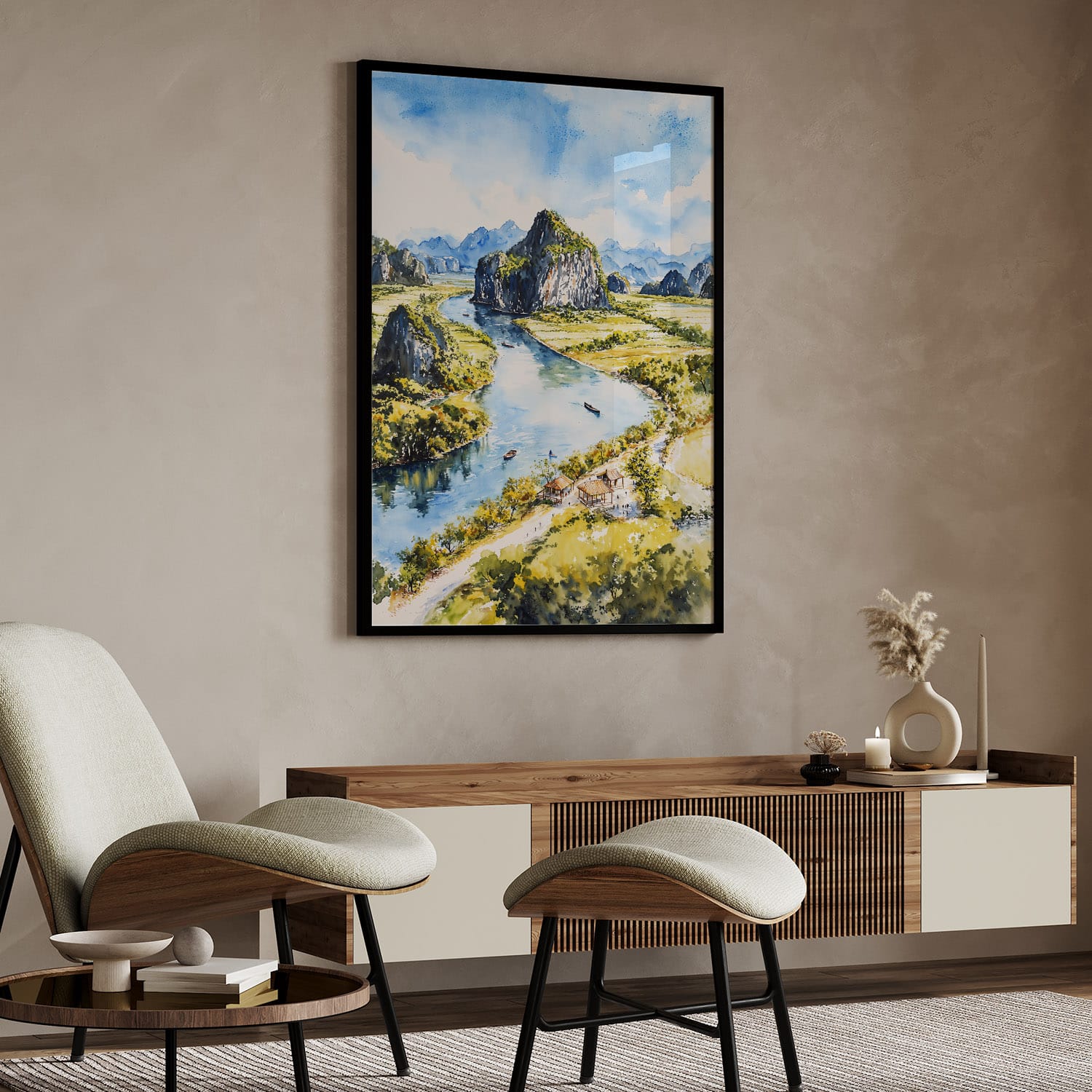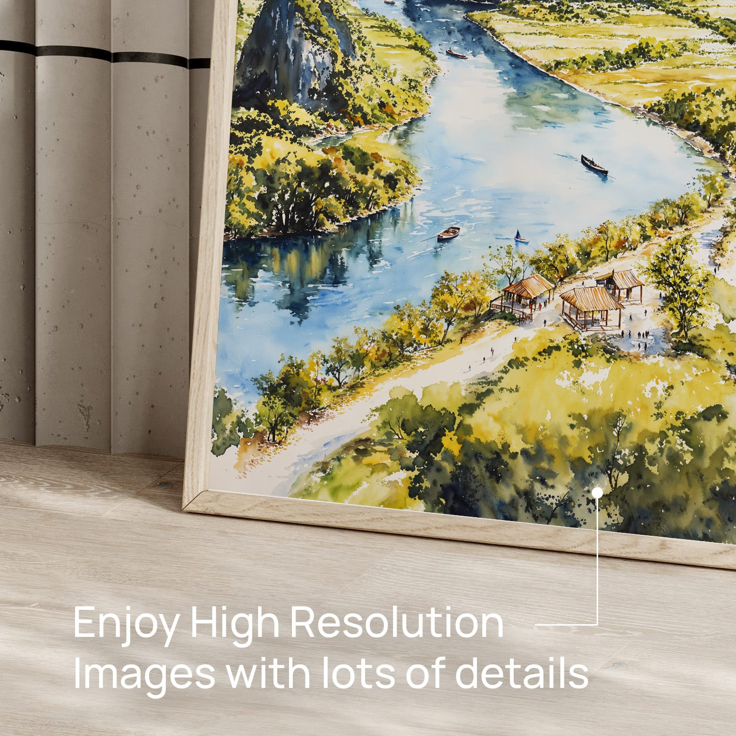 This artwork showcases the lush landscapes of Tam Coc Ninh Binh, with cascading hills and reflective waters. The refreshing colors bring life to any room, creating a calm and inviting atmosphere. Available in high-resolution digital files, you can print it in various sizes at home or take it to a local print shop. This piece is perfect for your living room, bedroom, or office, allowing you to enjoy a slice of nature’s beauty instantly.