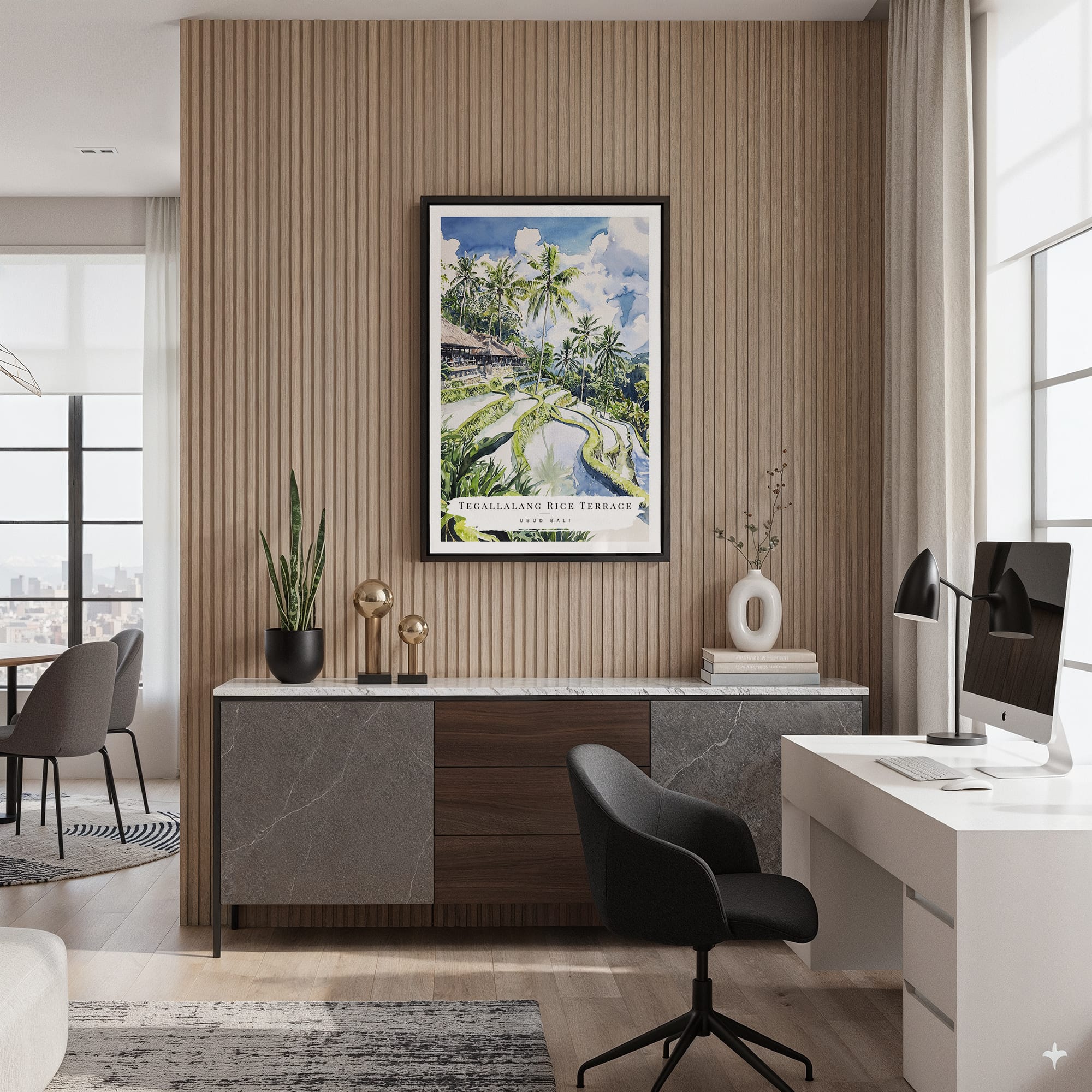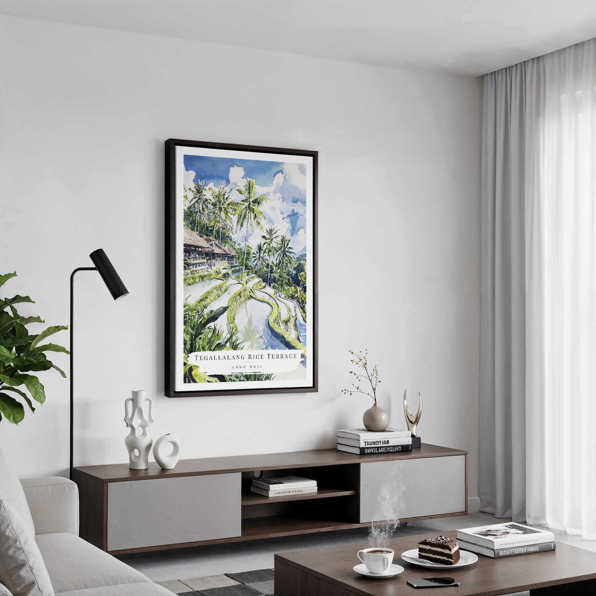 Enhance your space with this Tegallalang Rice Terrace canvas art print, showcasing lush greens and tranquil blues. Ideal for living rooms or offices, it’s a simple way to refresh your decor or gift someone special.