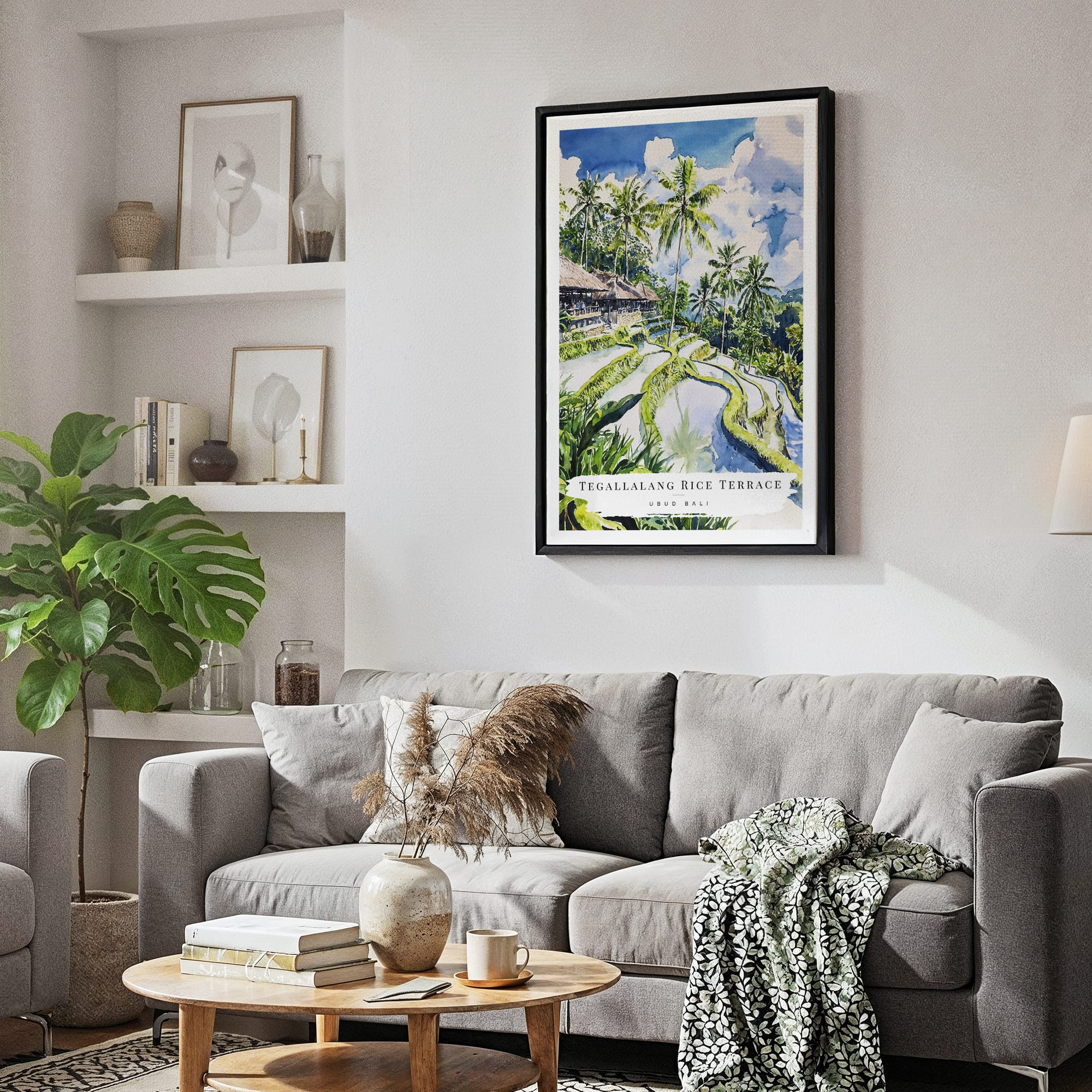 This artwork beautifully captures the iconic Tegallalang Rice Terrace in Ubud, Bali, with vibrant greens and soft blues. It brings a relaxed and inviting ambiance to any room, making your space feel both modern and homey. Printed on high-quality, fade-resistant canvas and wrapped around solid wood stretcher bars, this piece is ready to hang. It works wonderfully in living rooms, bedrooms, or creative spaces. A thoughtful addition to your home or a gift for those who appreciate nature and travel.