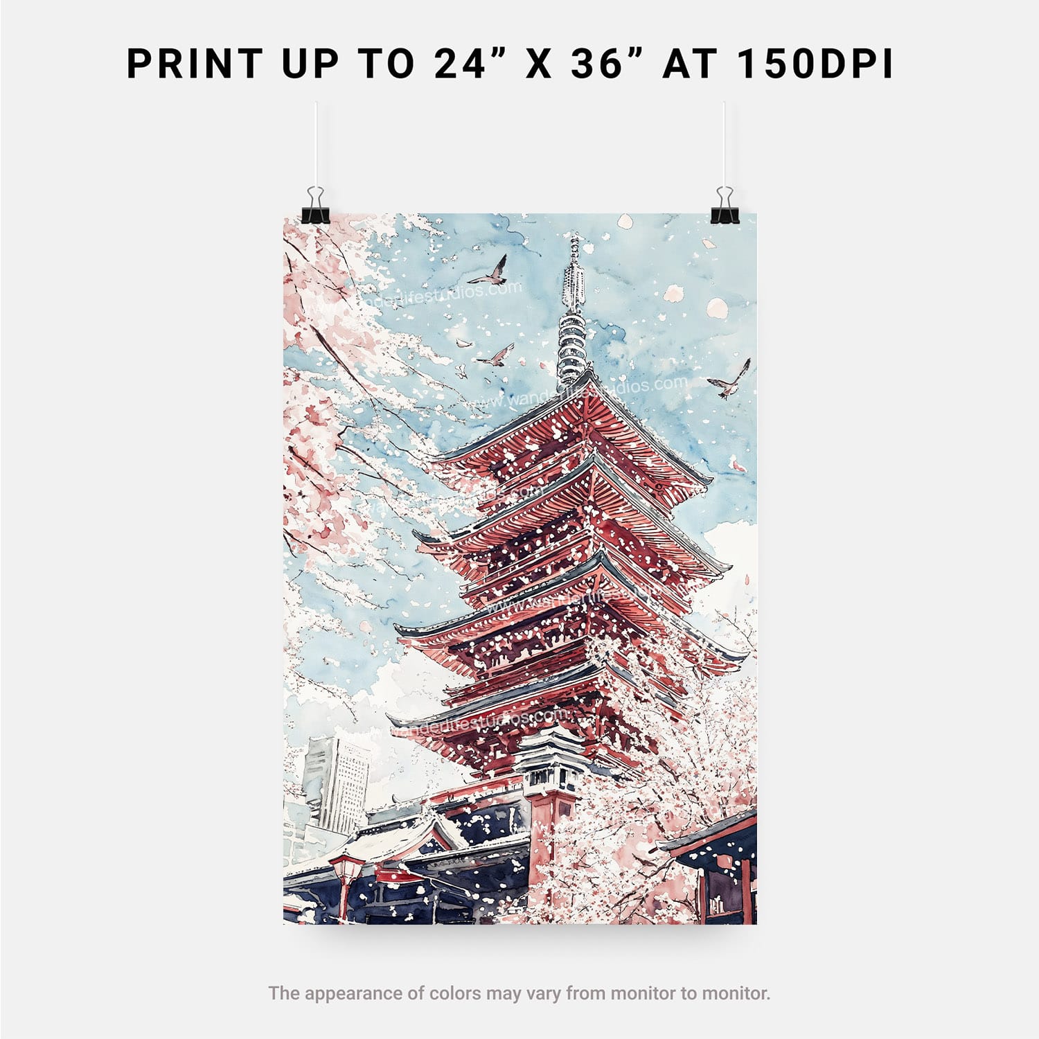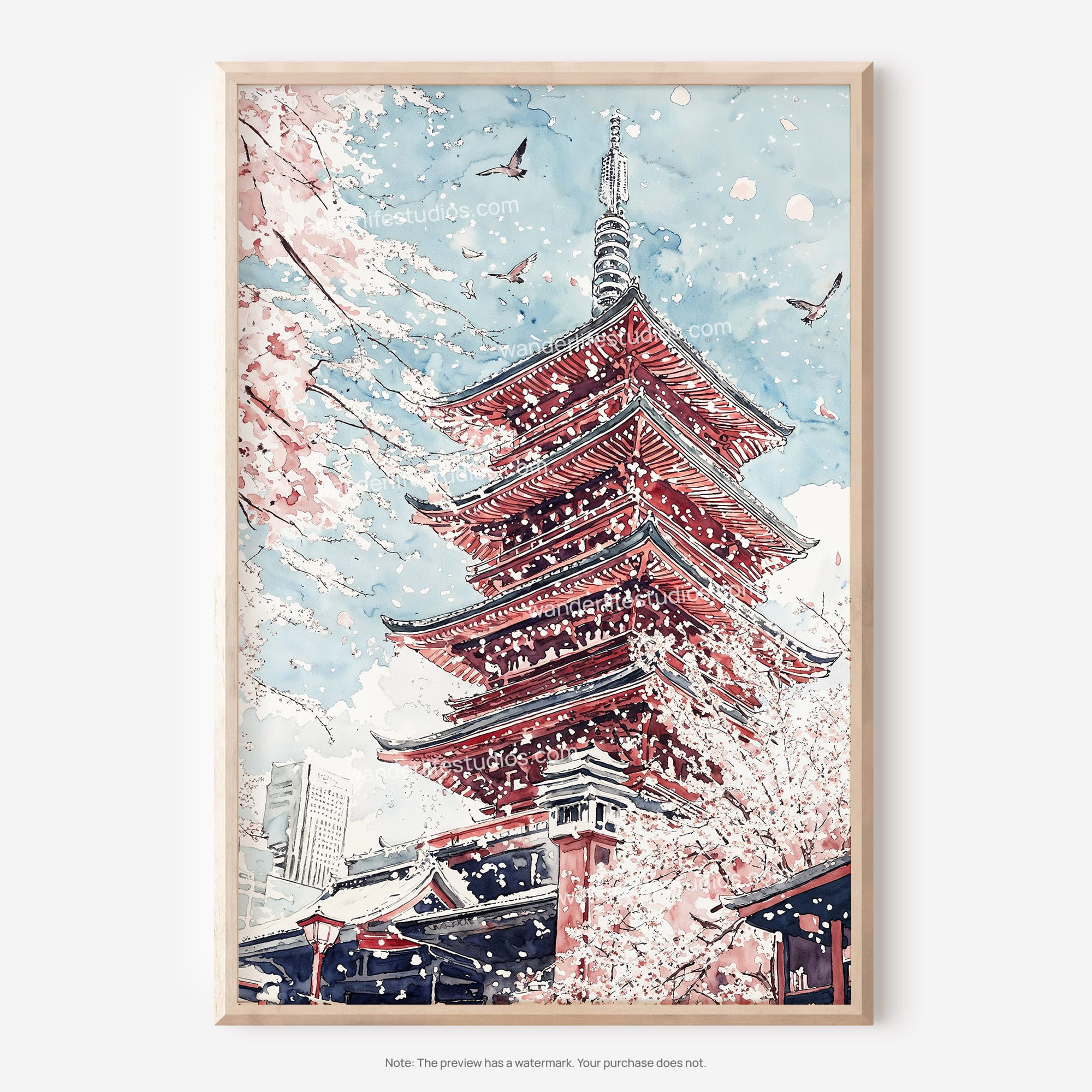 Tokyo Sakura Watercolor Art – Digital Download of Cherry Blossom Temple Scene