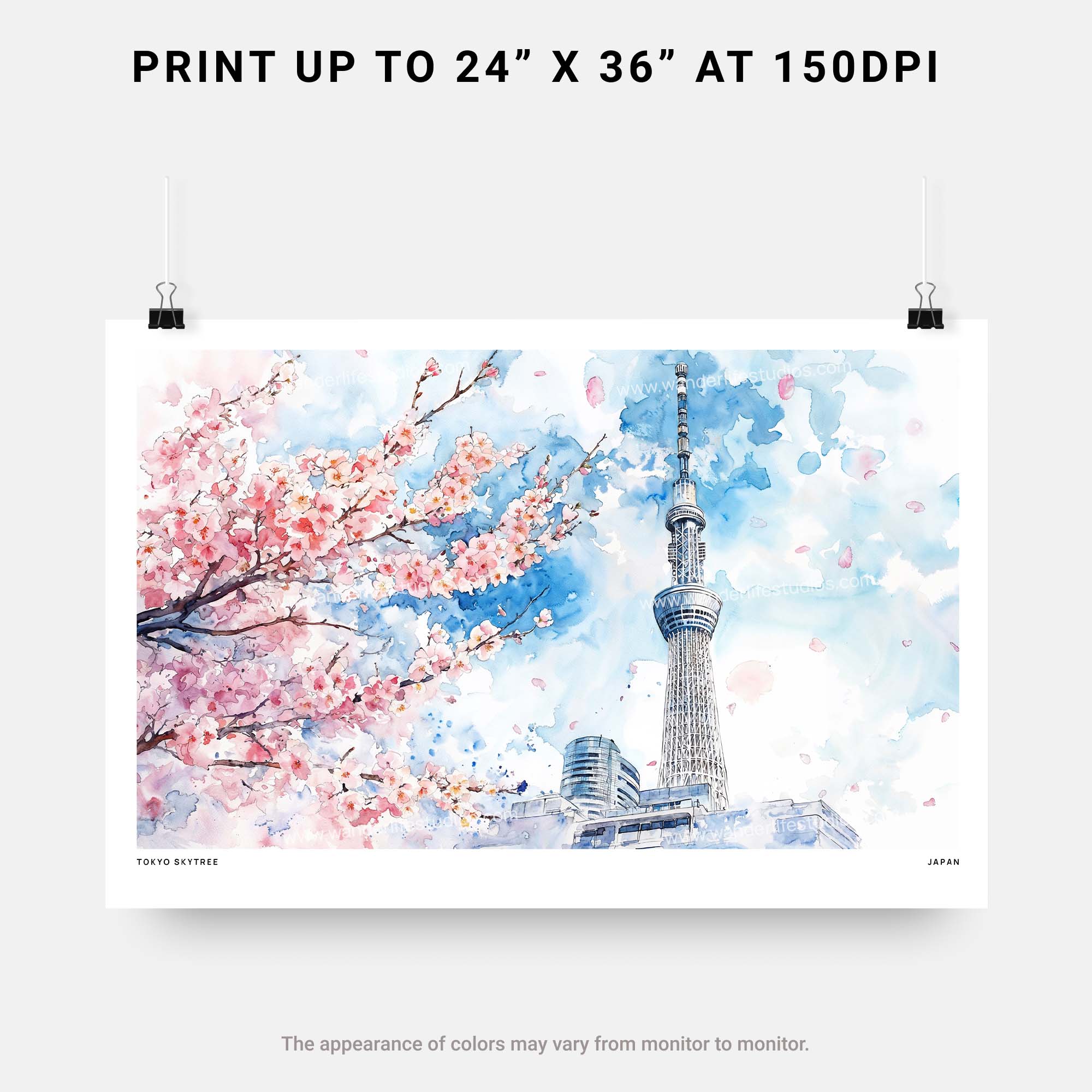 Tokyo Skytree Watercolor Art – Cherry Blossom Digital Download Print