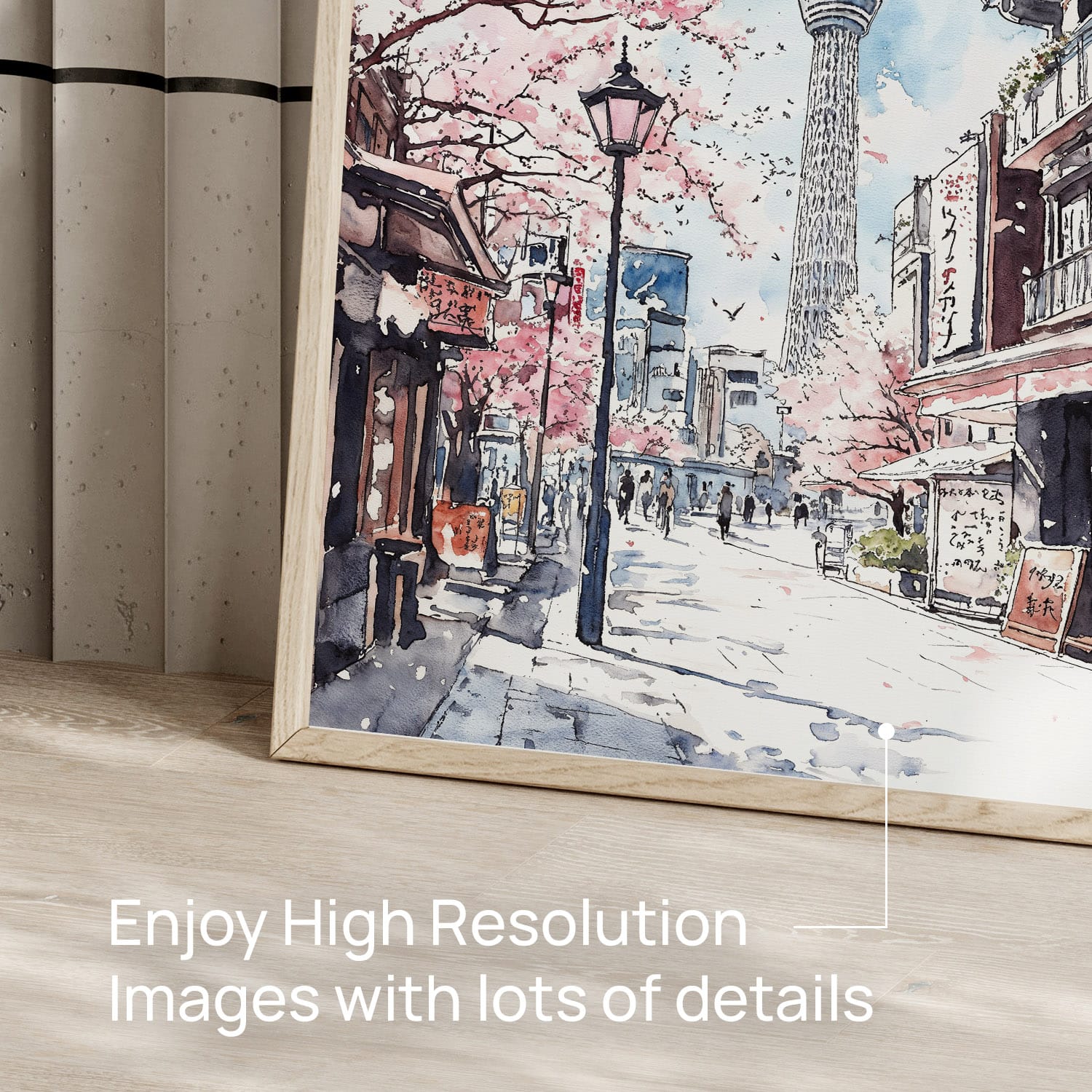 This Tokyo Skytree watercolor artwork showcases vibrant pink cherry blossoms against a clear blue sky. Enjoy the convenience of instant download, allowing you to print and display this piece in your space quickly and easily.