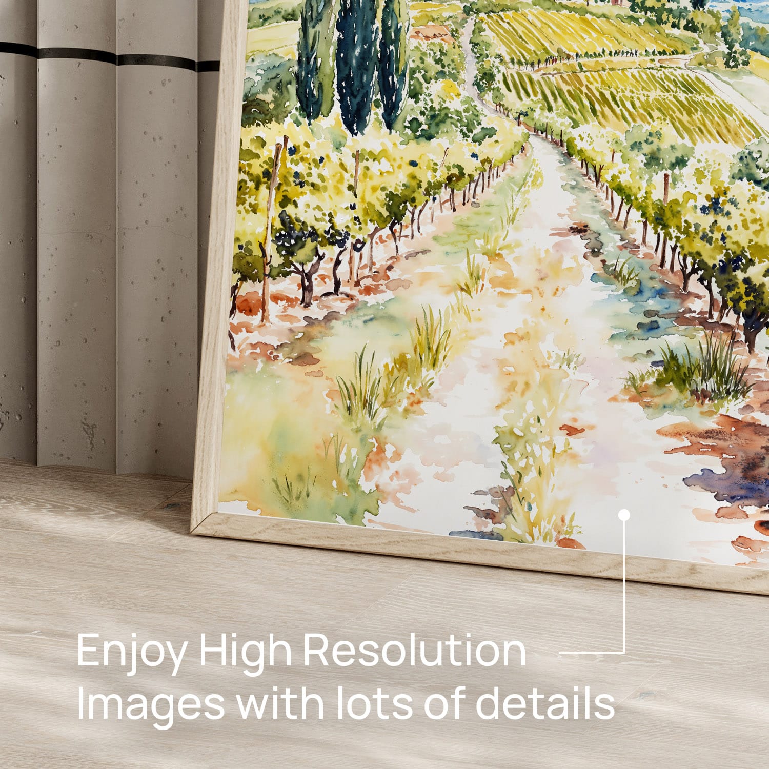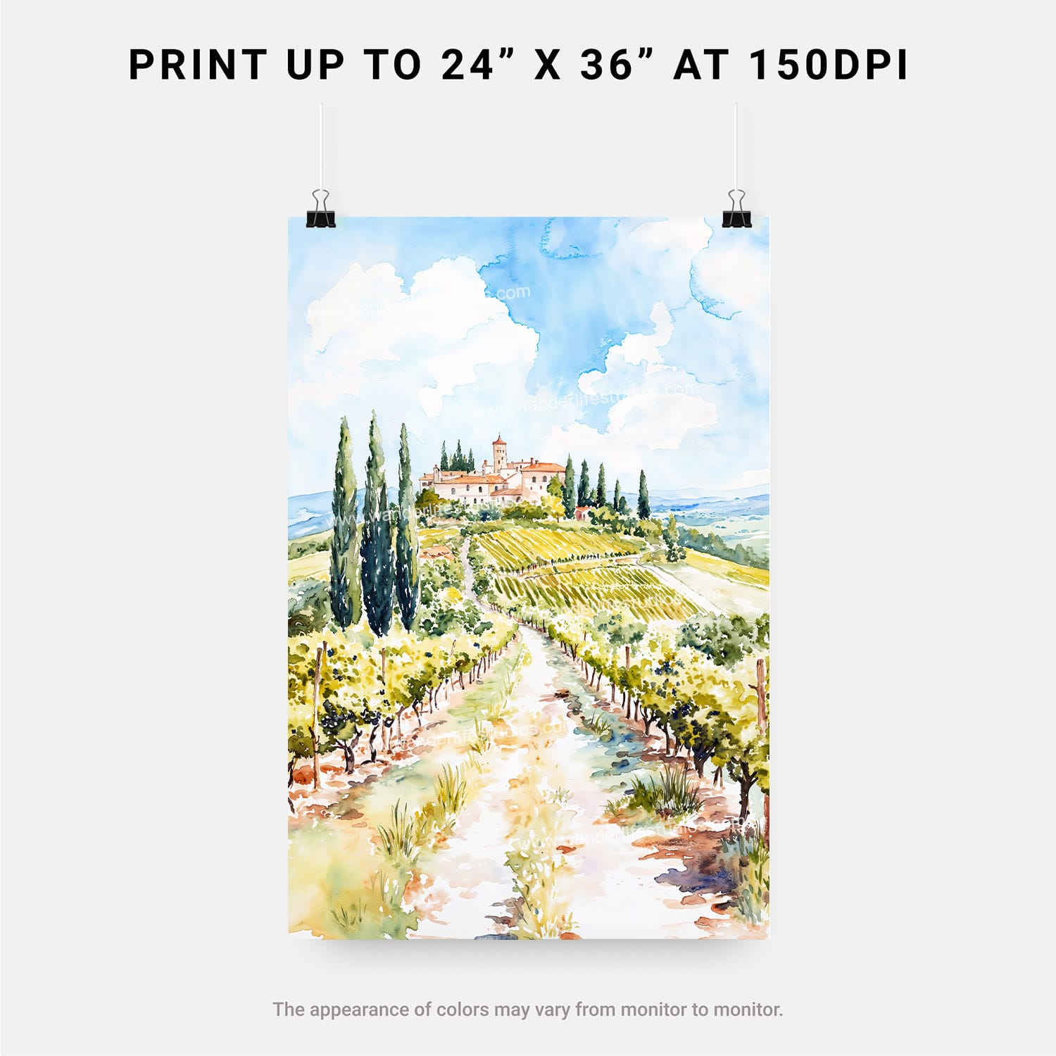 Add a touch of Tuscany to your home with this watercolor landscape digital download. Featuring lush vineyards and soft skies, it’s easy to print and display immediately in any setting.