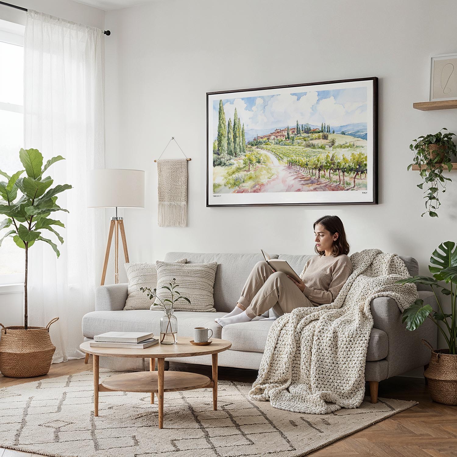 Bring the rolling hills of Tuscany into your home with this watercolor canvas print. Perfect for living rooms or offices, it’s ready to hang and adds a touch of Italian beauty anywhere.