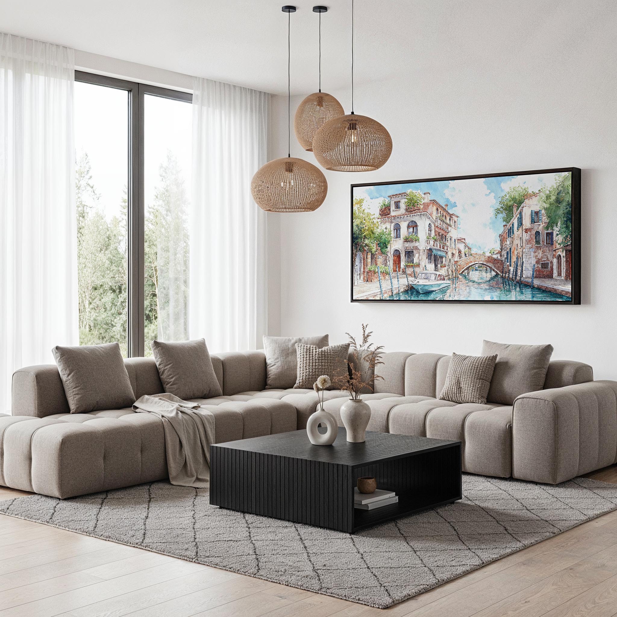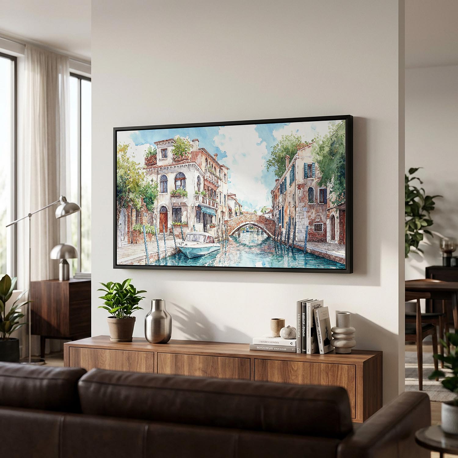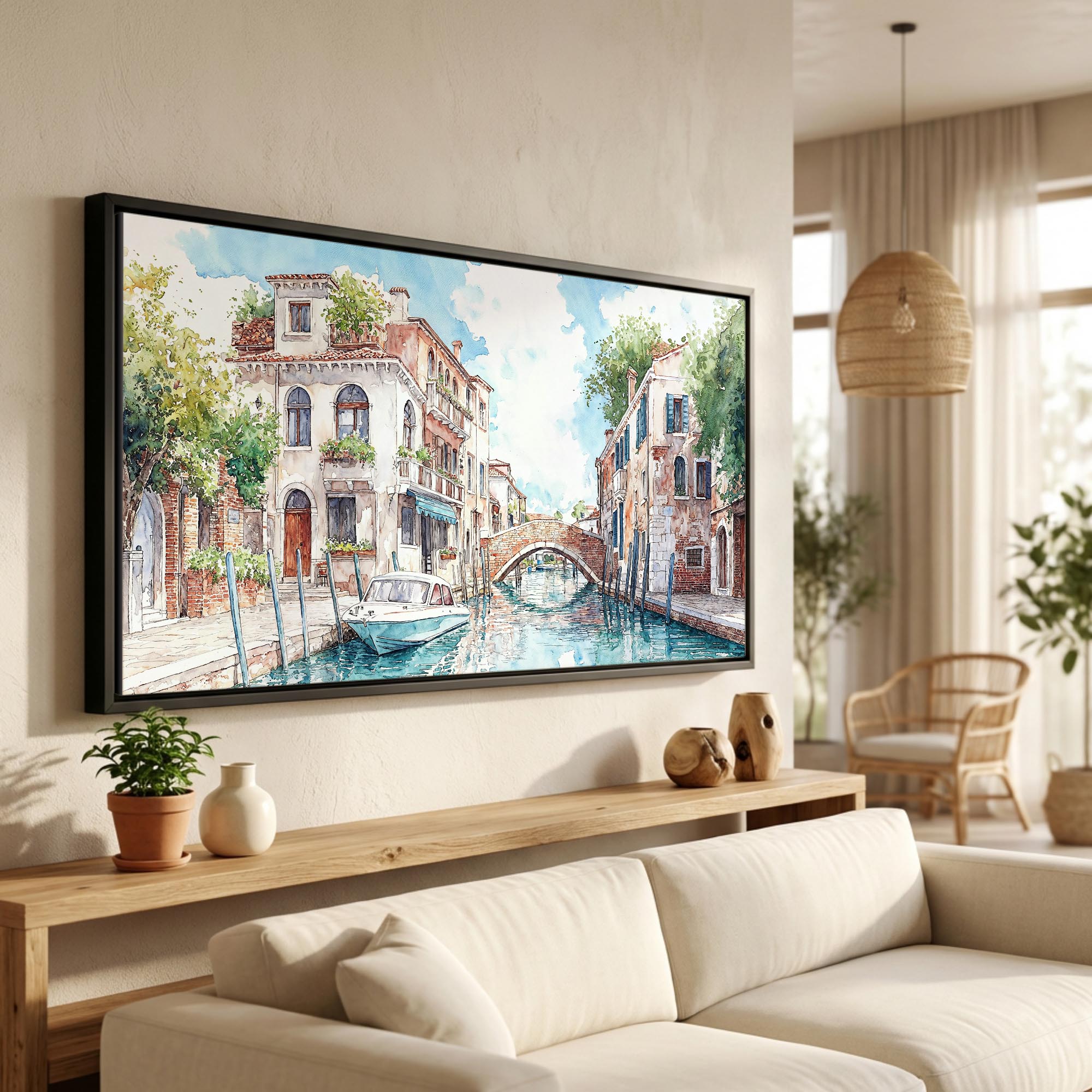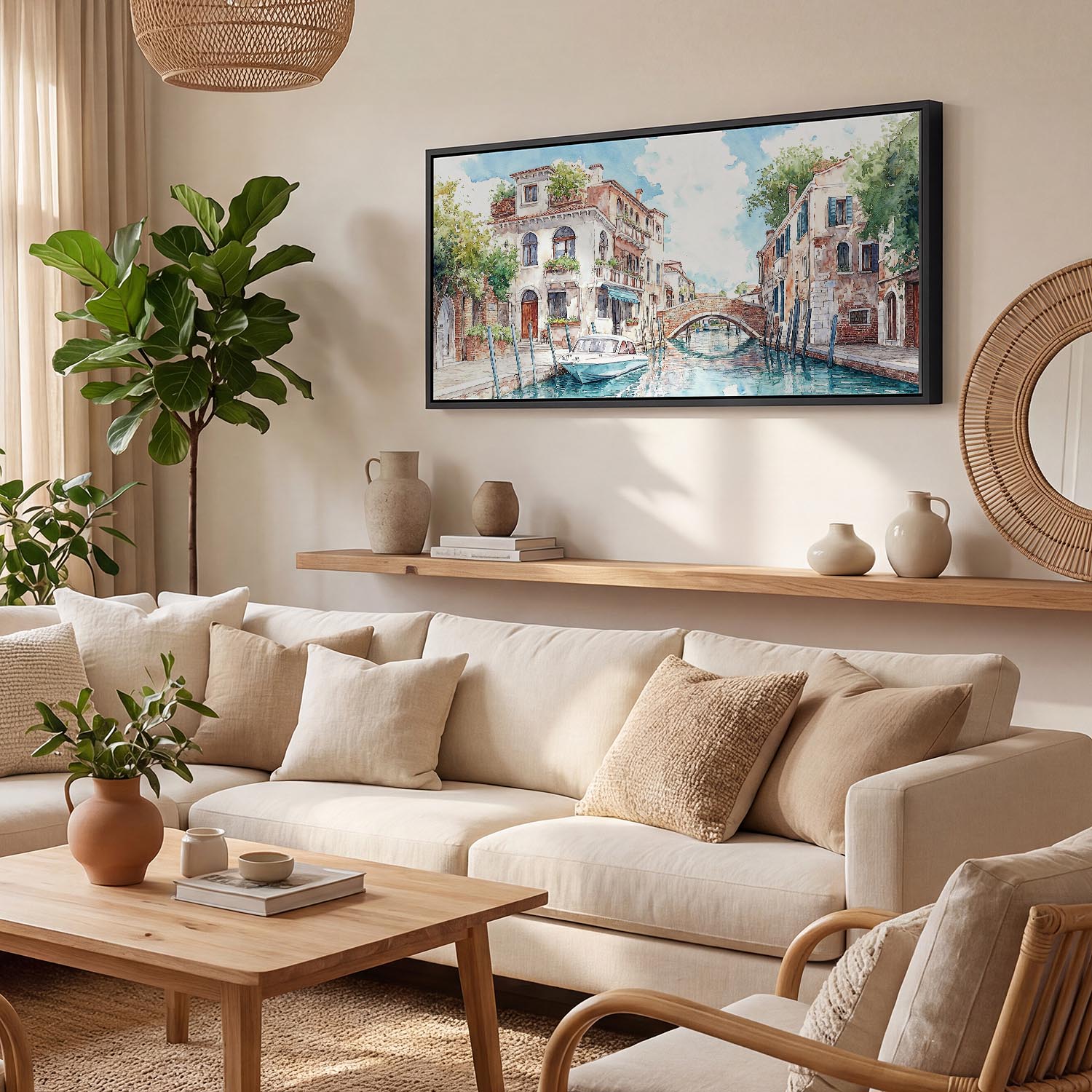 This artwork captures the enchanting canals of Venice, showcasing picturesque buildings and tranquil waters. With its expansive 2:1 panoramic format, this print enhances the ambiance of any room, creating a sense of depth and openness. Crafted in the US on hand-stretched canvas with fade-resistant inks and a matte finish, it’s designed to last and comes ready to hang. Ideal for display above sofas, in hallways, or offices, this piece makes for a thoughtful gift or a personalized addition to your own collection.