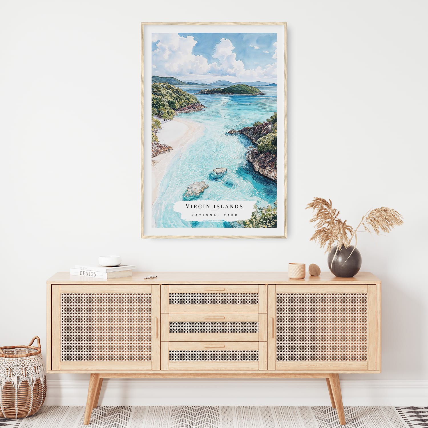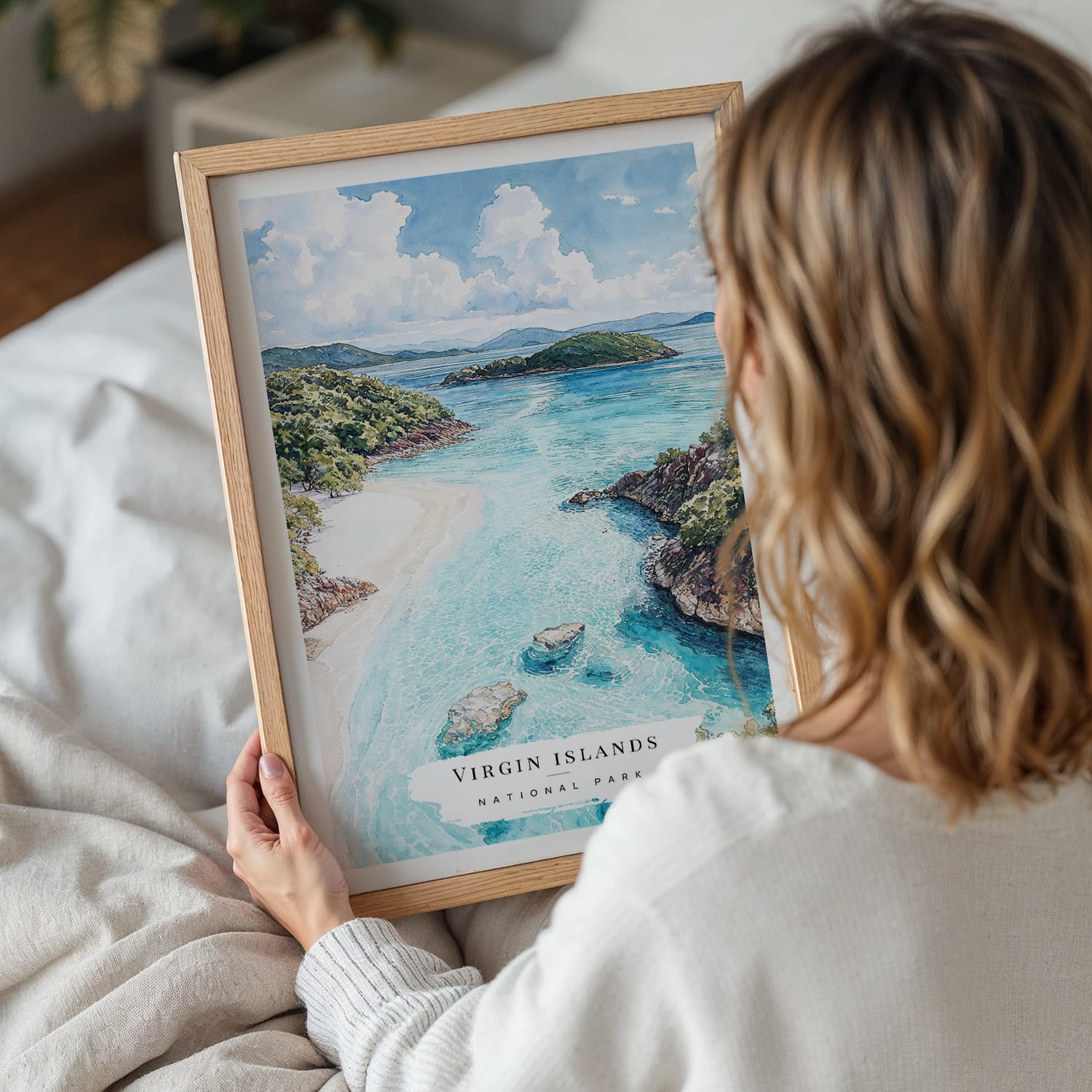 Bring the tranquil beauty of Virgin Islands National Park into your home with this watercolor art print. Ideal for nature lovers, it showcases crystal-clear waters and lush greenery.