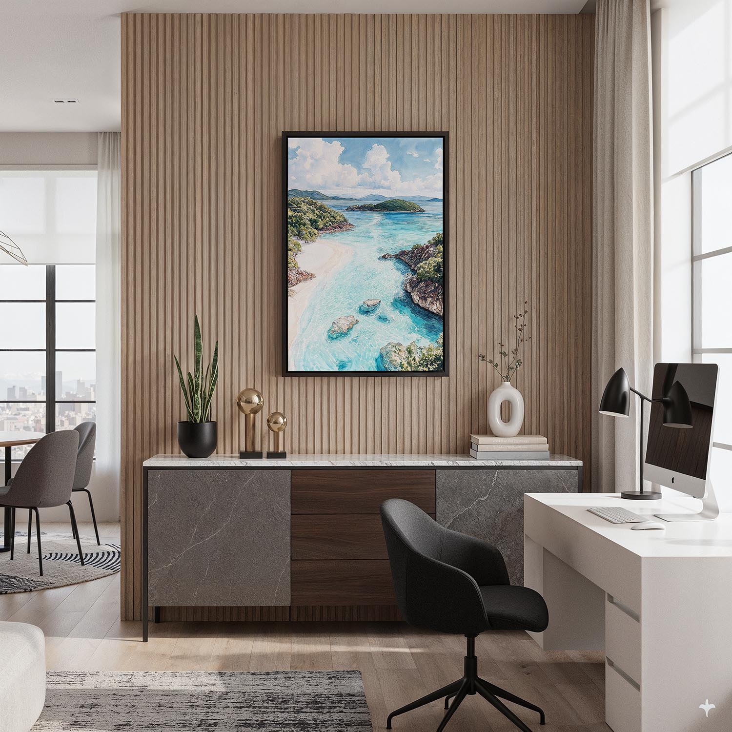 Available in various finishes, including unframed and floater frame options, this piece uses hand-stretched canvas and fade-resistant inks for lasting quality. It’s ready to hang above a sofa, in a home office, or in any room needing a touch of coastal charm.