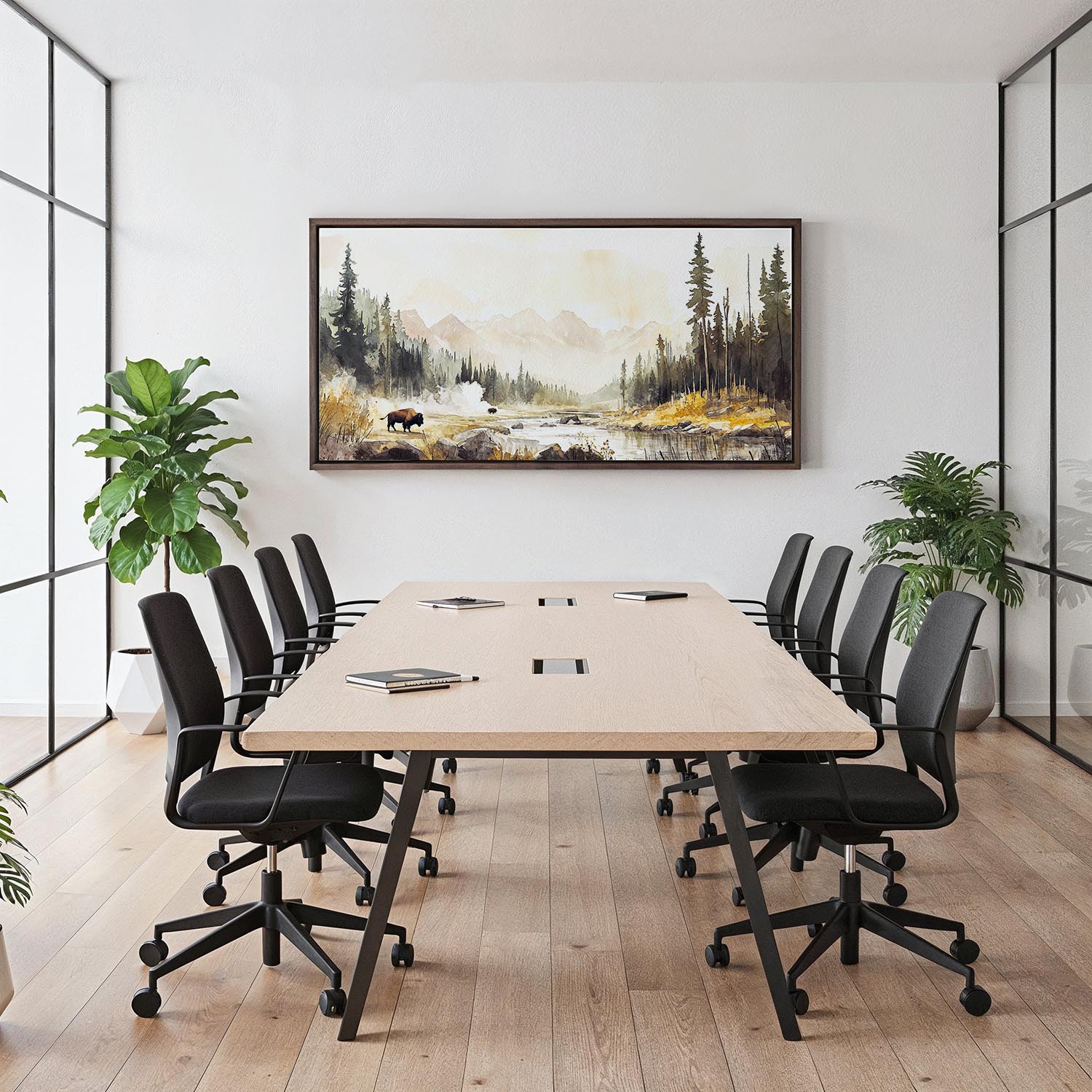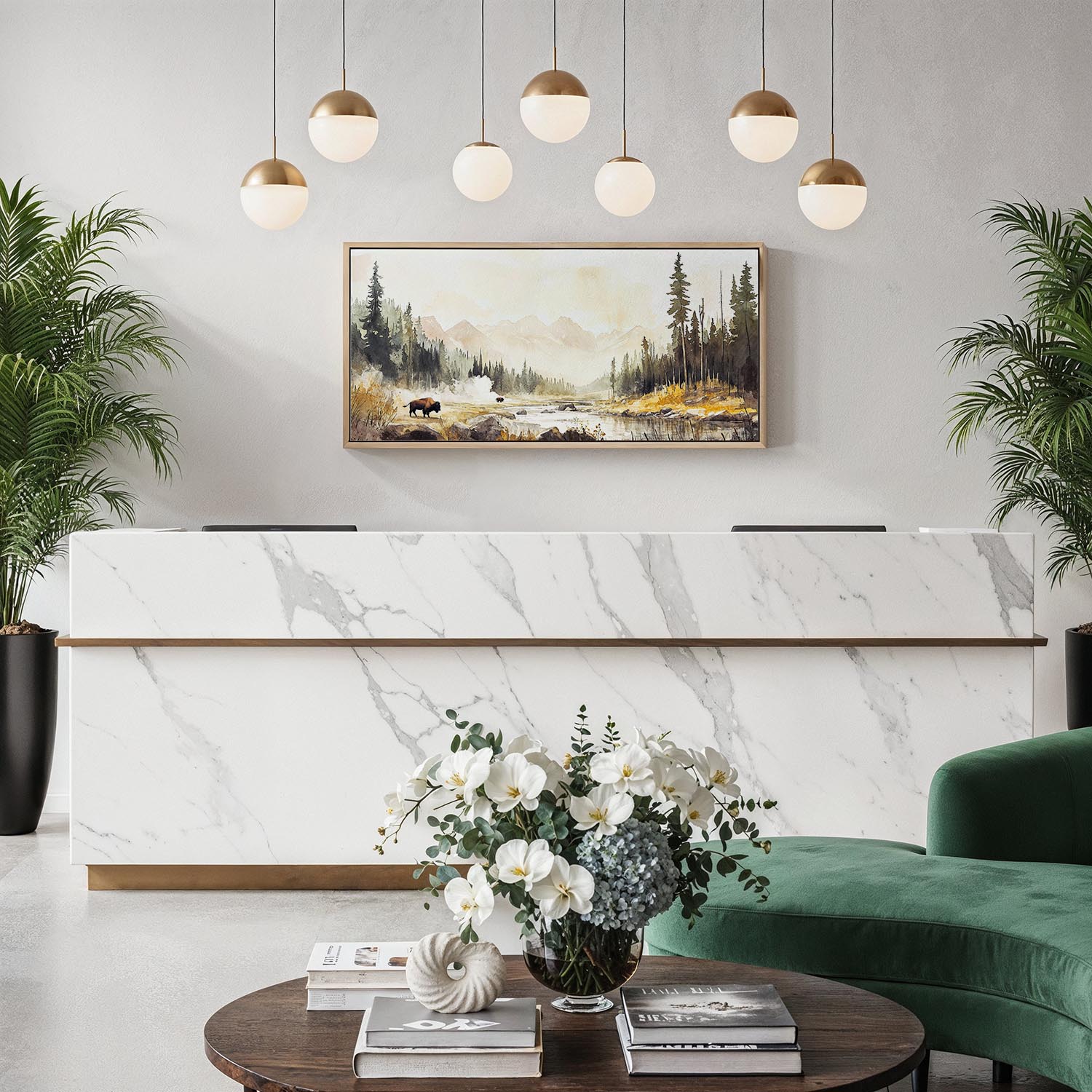 This artwork captures the essence of Yellowstone, with bison roaming through a peaceful landscape of mountains and forests. The wide 2:1 panoramic format reshapes the room, creating an inviting atmosphere and a sense of openness. Crafted with premium materials, this canvas features hand-stretched fabric, fade-resistant inks, and solid wood stretcher bars, ensuring it’s ready to hang upon arrival and sustainably made in the USA. Perfect for above sofas, in hallways, or in creative offices, it makes a thoughtful gift or a cherished piece for any nature enthusiast.