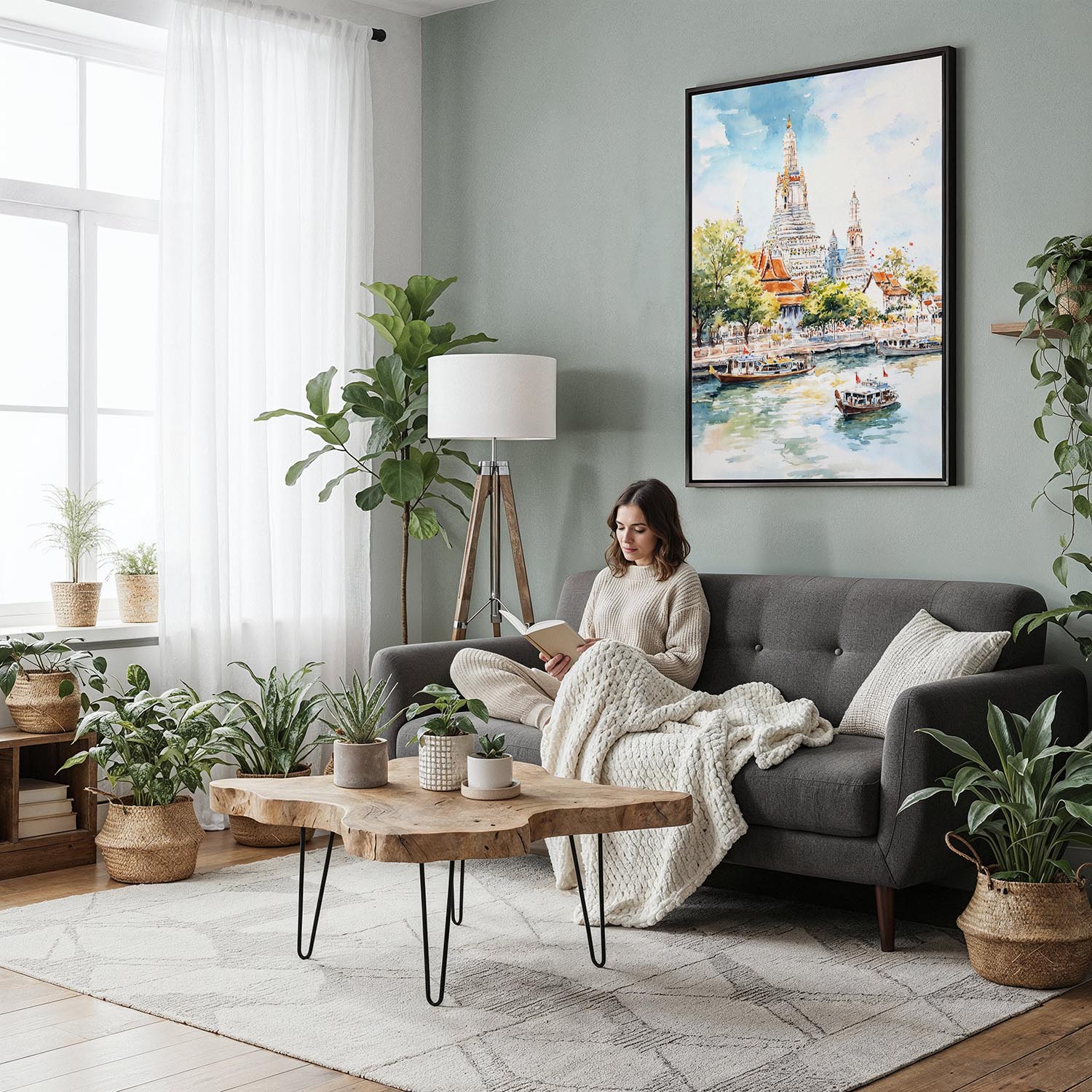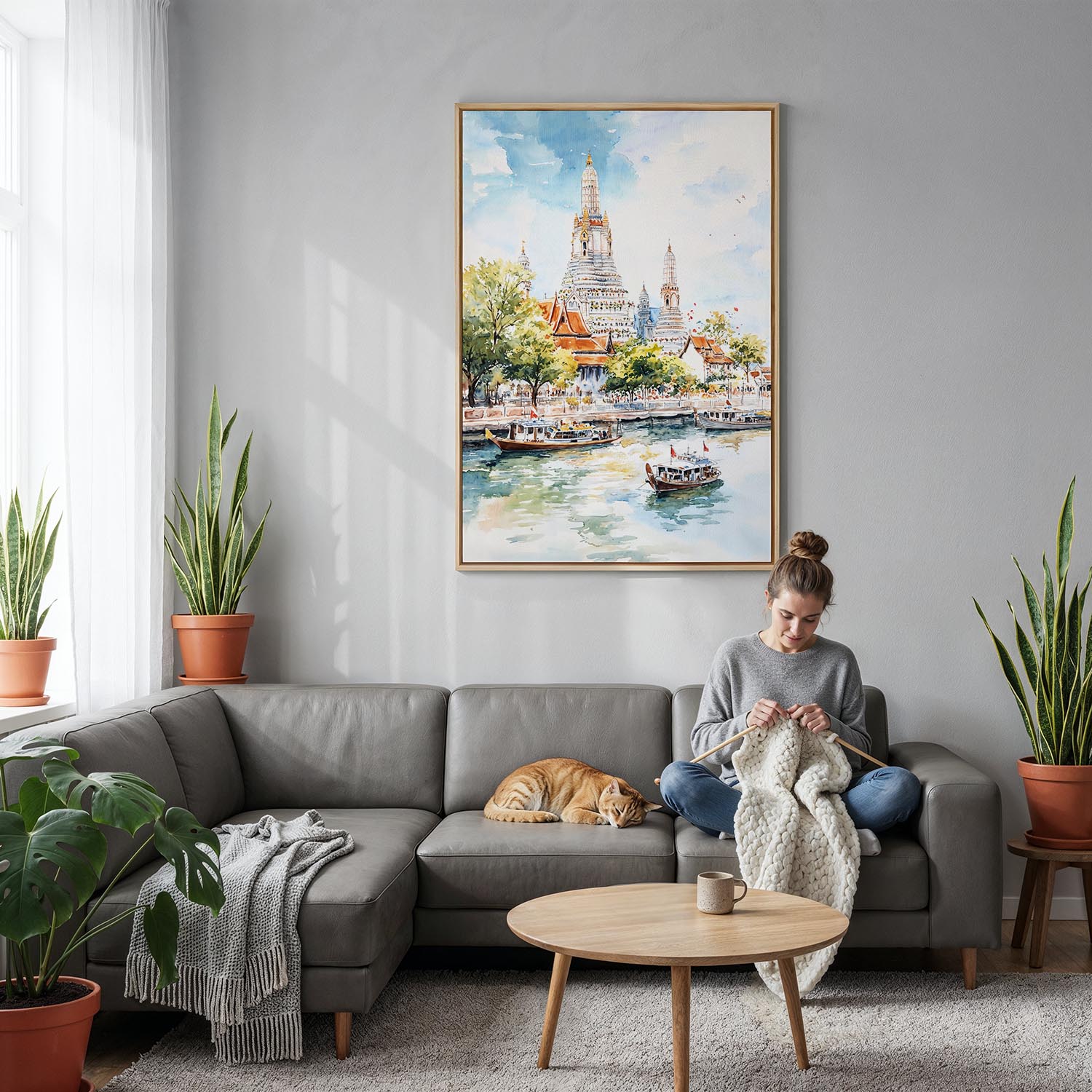 Step into the charm of Bangkok with this stunning piece featuring the iconic Wat Arun Temple. The artwork beautifully captures the temple’s intricate architecture and lush riverside setting, inviting the vibrant energy of the city into your space.