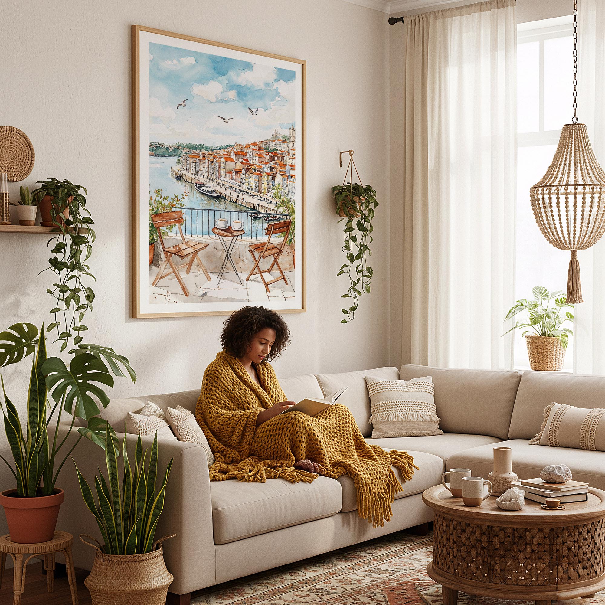 Experience the relaxed vibe of Porto with this watercolor art print showcasing a charming riverside scene with coffee. It’s an inviting piece for dreamers and travel lovers alike.