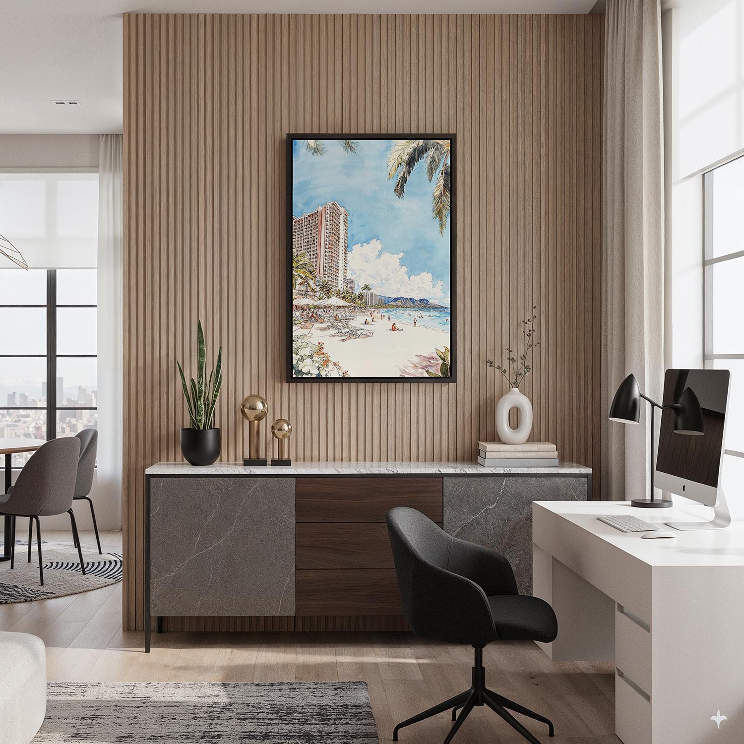 This canvas print captures the vibrant essence of Maui’s stunning shoreline. The artwork showcases golden beaches, swaying palms, and the serene ocean, inviting you to feel the warmth of this Hawaiian paradise.