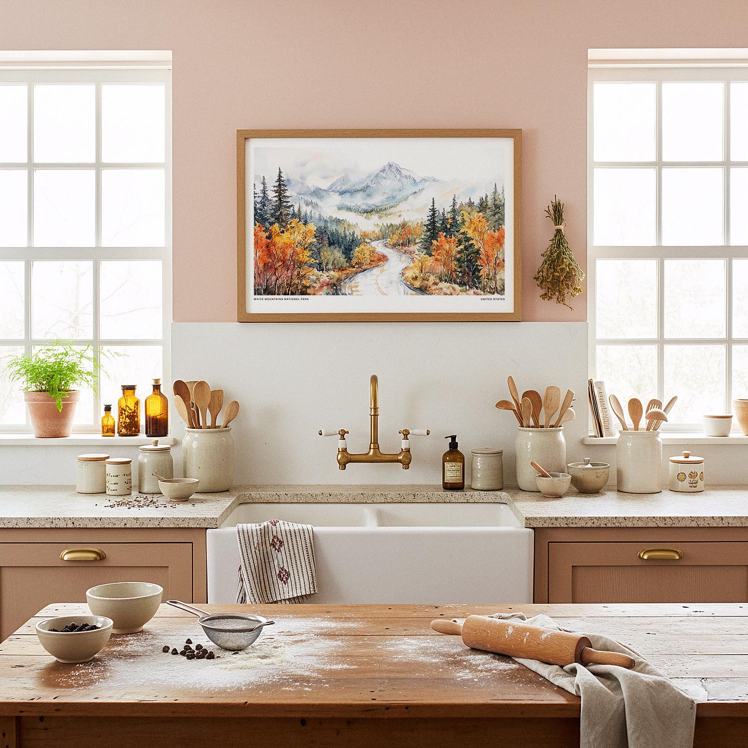 Capture the beauty of the White Mountains with this watercolor art print, showcasing vibrant autumn foliage and serene mountain scenery. It’s an inviting addition for travel lovers and nature enthusiasts.