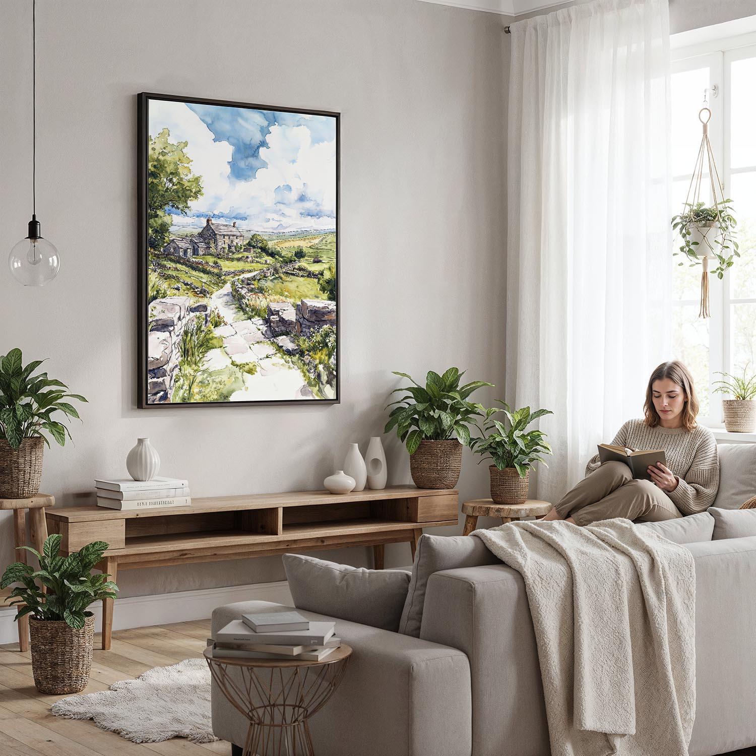Step into the serene countryside of Yorkshire with this watercolor canvas print. The artwork beautifully captures the lush greenery, rustic stone cottages, and vast skies that define this quaint region. Available in various finishes, including unframed options or with a floater frame, it’s designed to enhance any décor.