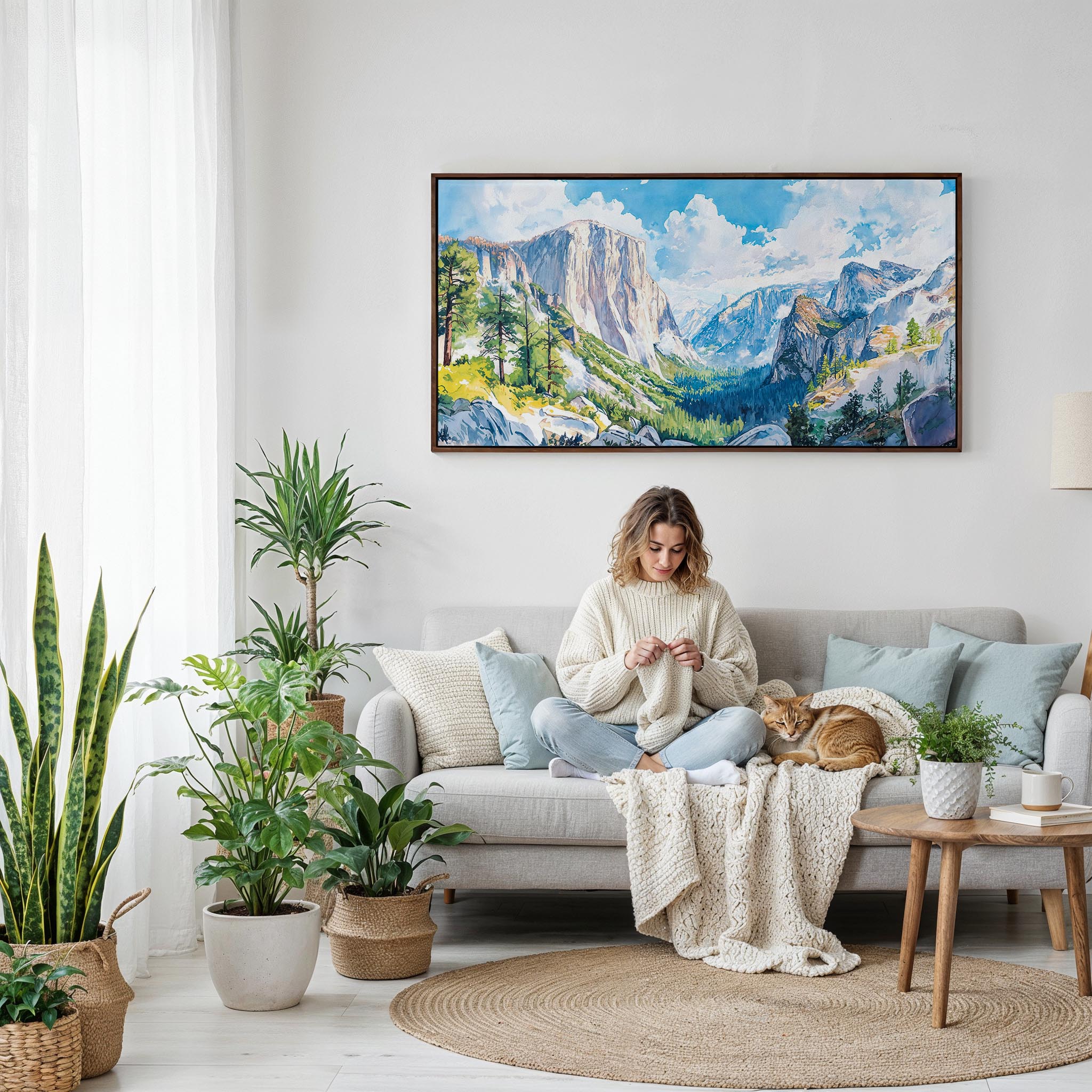 This artwork captures the iconic El Capitan within Yosemite National Park, showcasing dramatic peaks and lush valleys under a vibrant sky. The expansive 2:1 panoramic format enhances the room’s feel, making it a focal point without overwhelming the space. Crafted on hand-stretched canvas using fade-resistant inks and solid wood stretcher bars, it’s ready to hang and sustainably made in the USA. Ideal for display above sofas, in hallways, or creative offices, it’s a thoughtful gift or a cherished piece for nature enthusiasts.