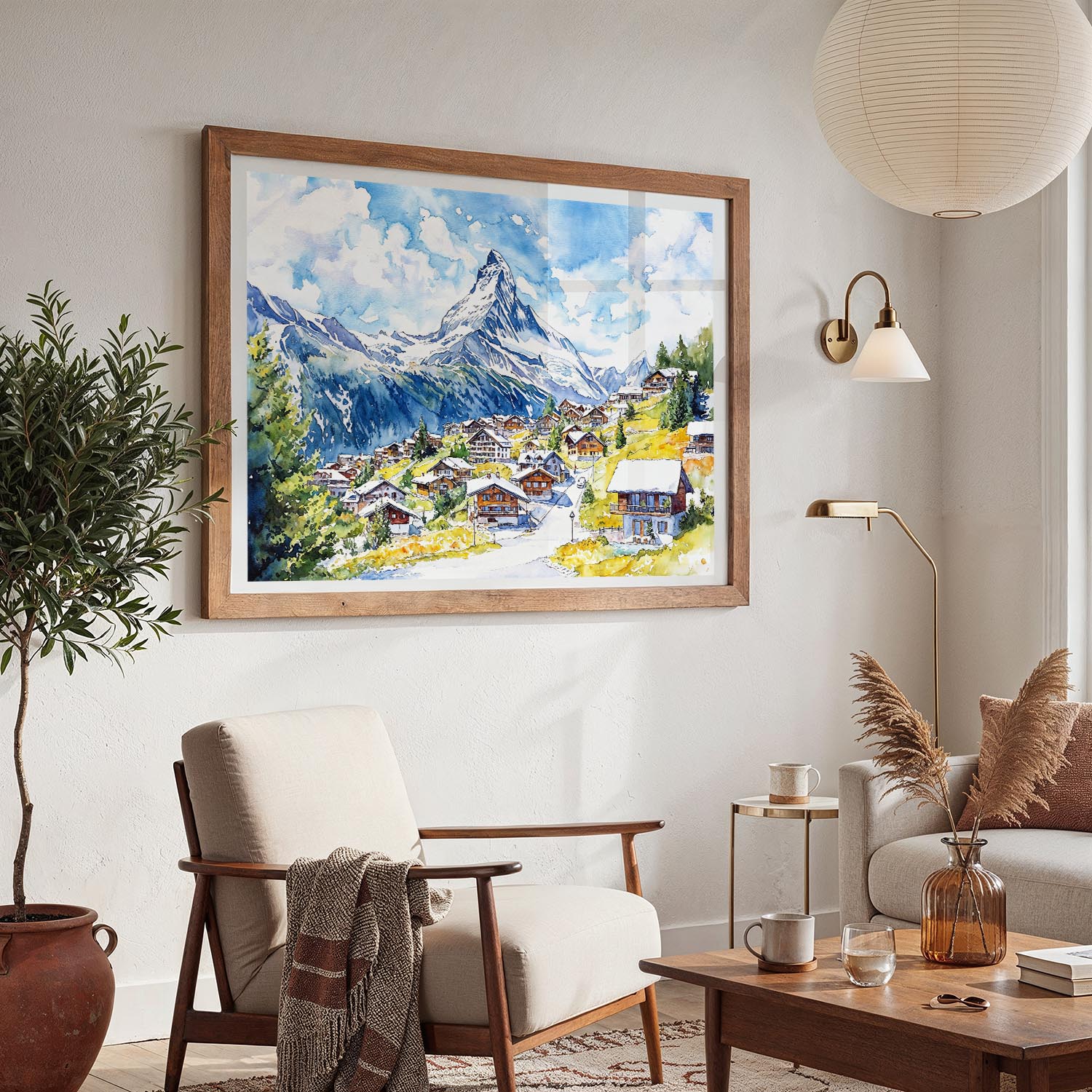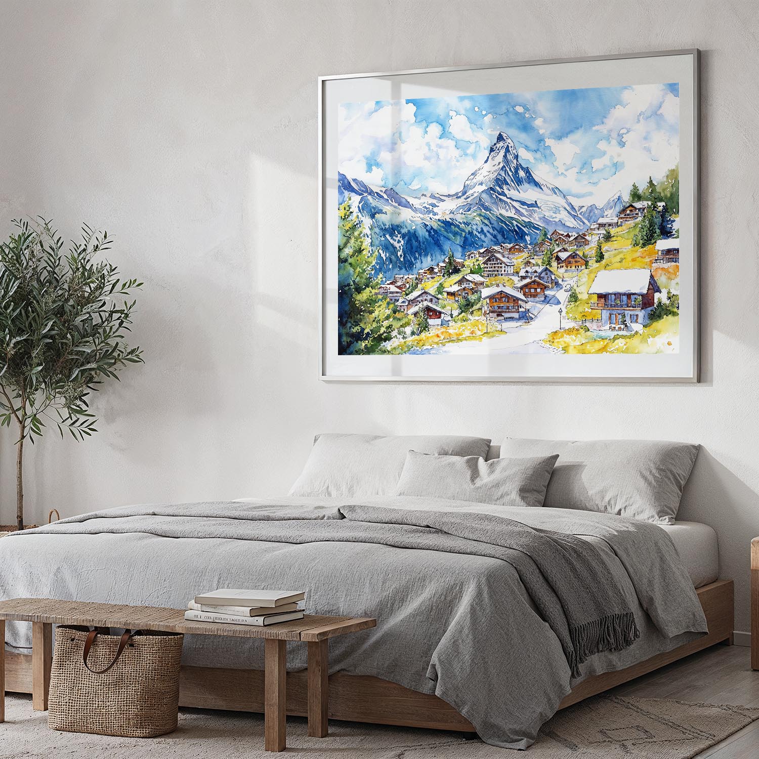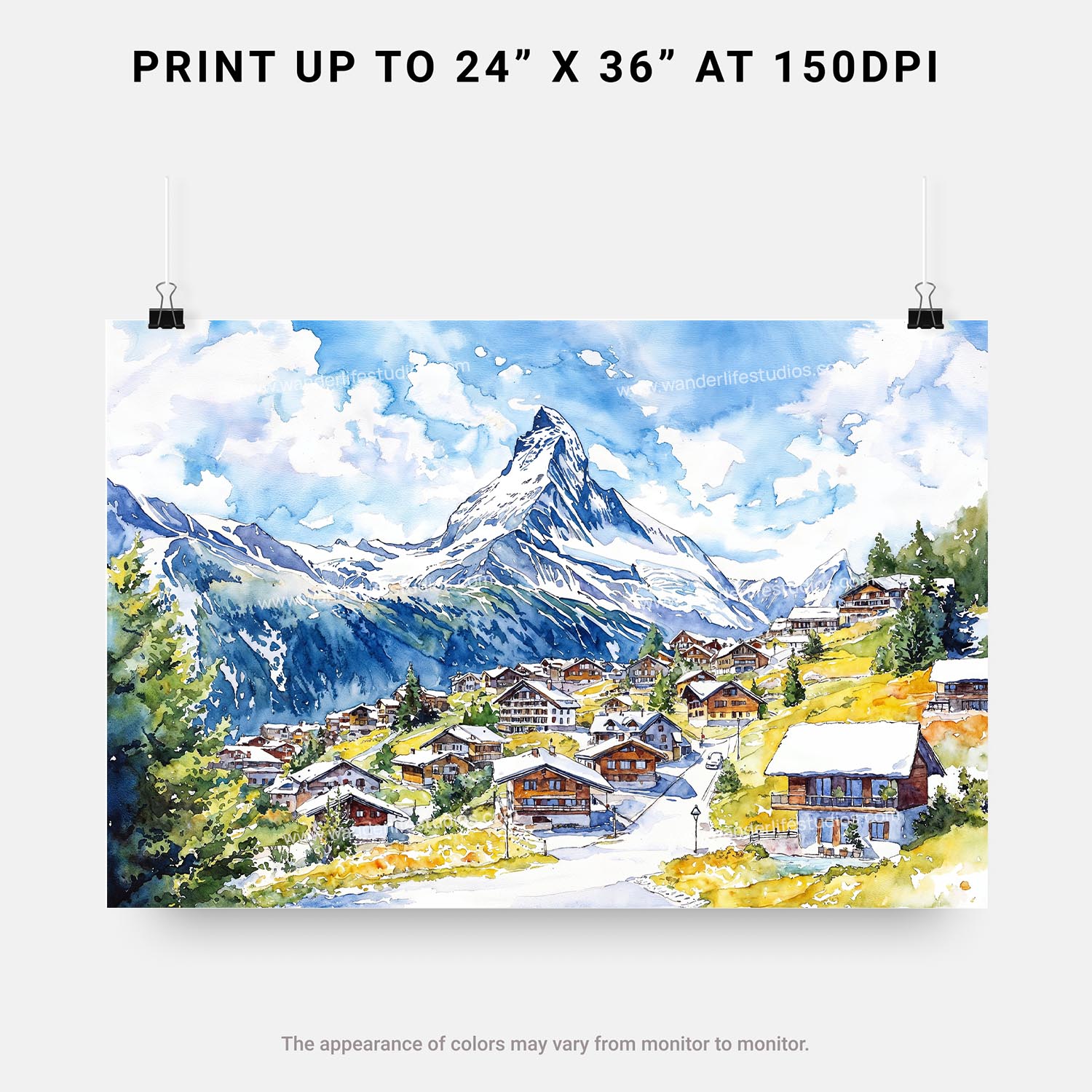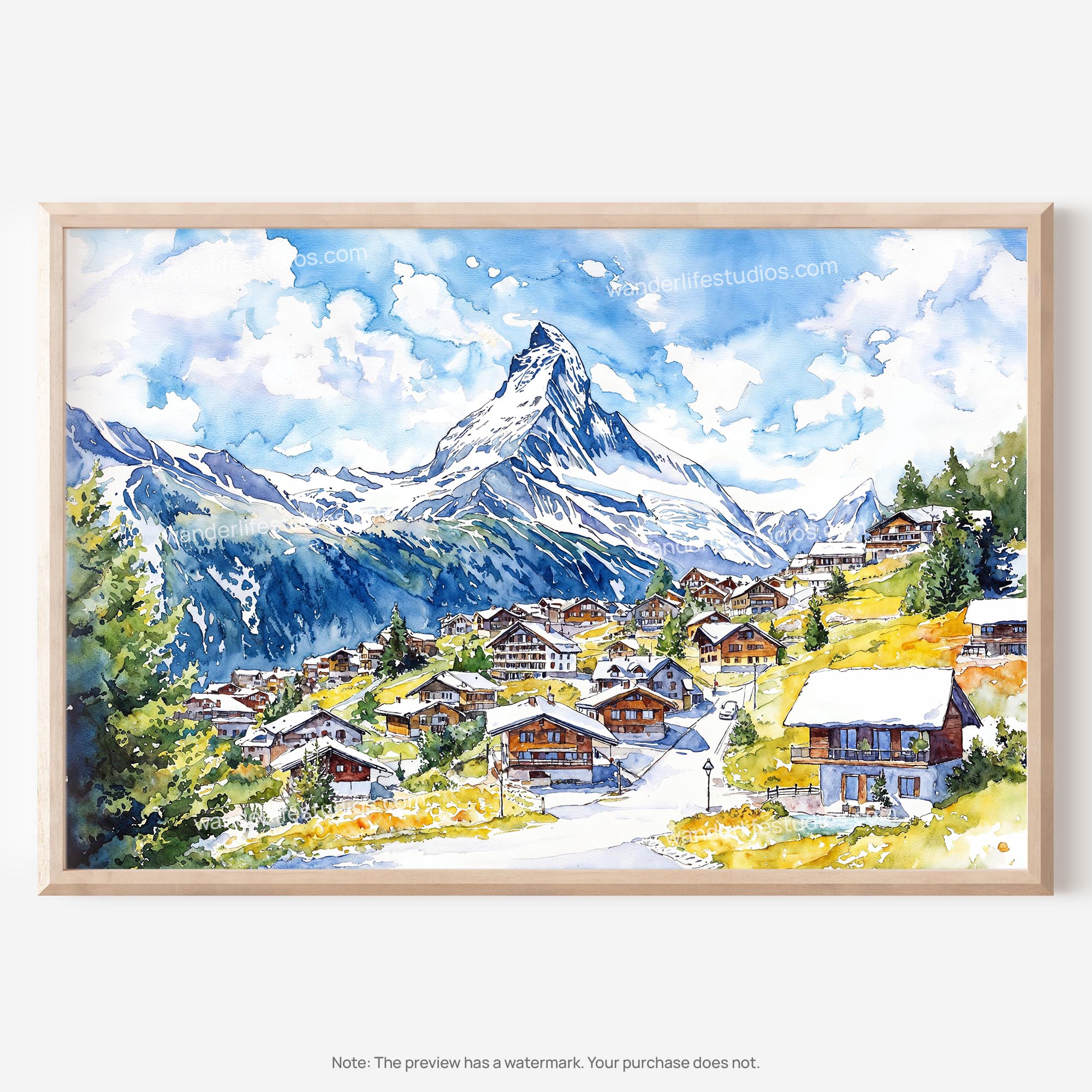 Transform your space with this Zermatt watercolor digital download wall art. Featuring a charming village with the iconic Matterhorn, it offers instant access for easy printing, perfect for home or office display.
