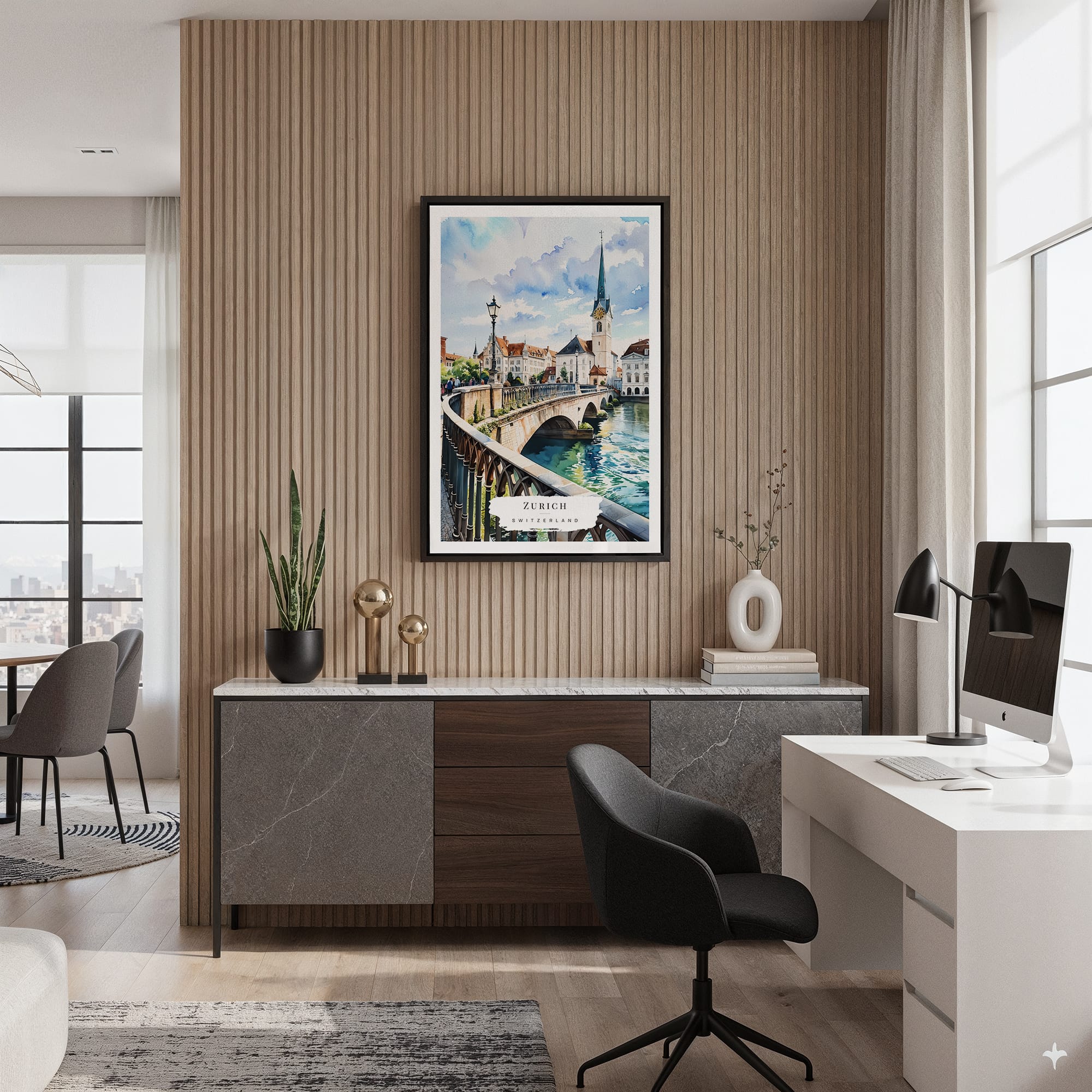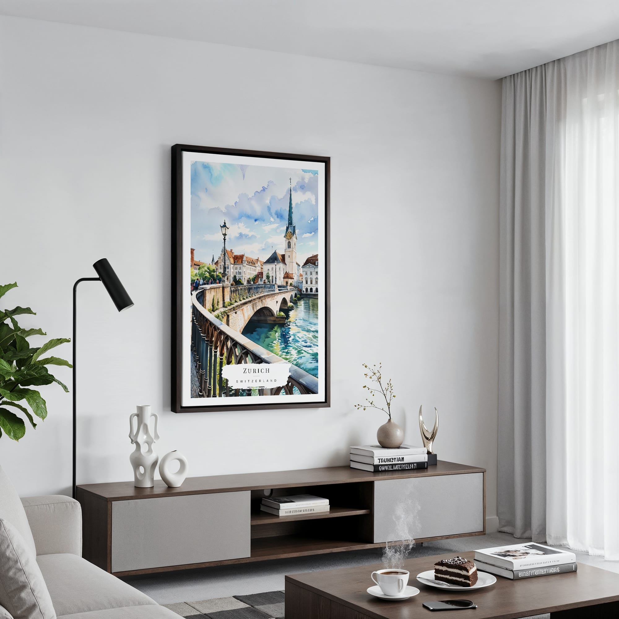 This artwork features a beautiful depiction of Zurich, showcasing its charming architecture and tranquil waters. Soft blues and warm tones create a welcoming atmosphere, making it an inviting addition to any room. Printed on quality canvas with fade-resistant inks, it is ready to hang and suitable for living rooms, bedrooms, or offices. This piece adds a touch of sophisticated travel flair, whether displayed in your home or given as a gift to a wanderer.